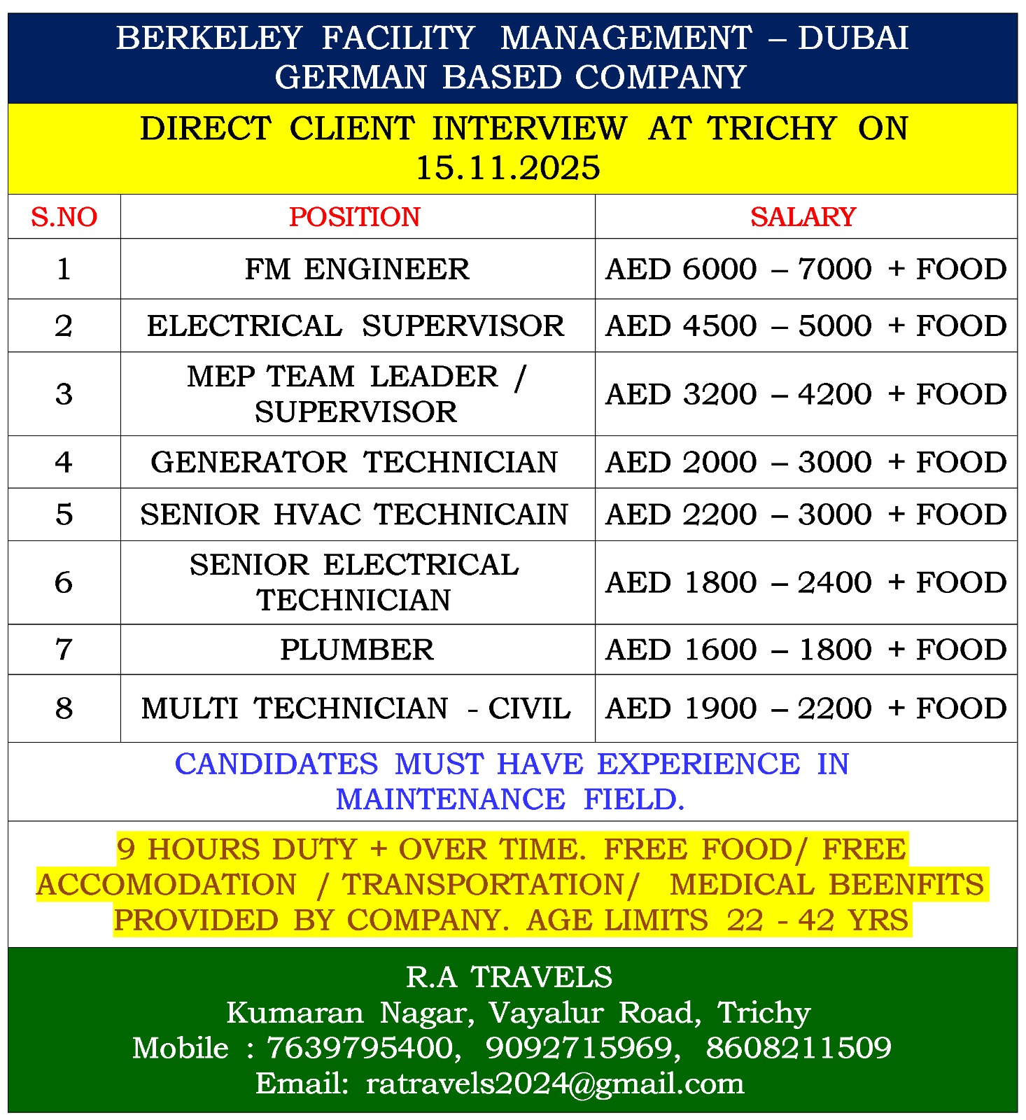 Send CV To: ratravels2024@gmail.com
